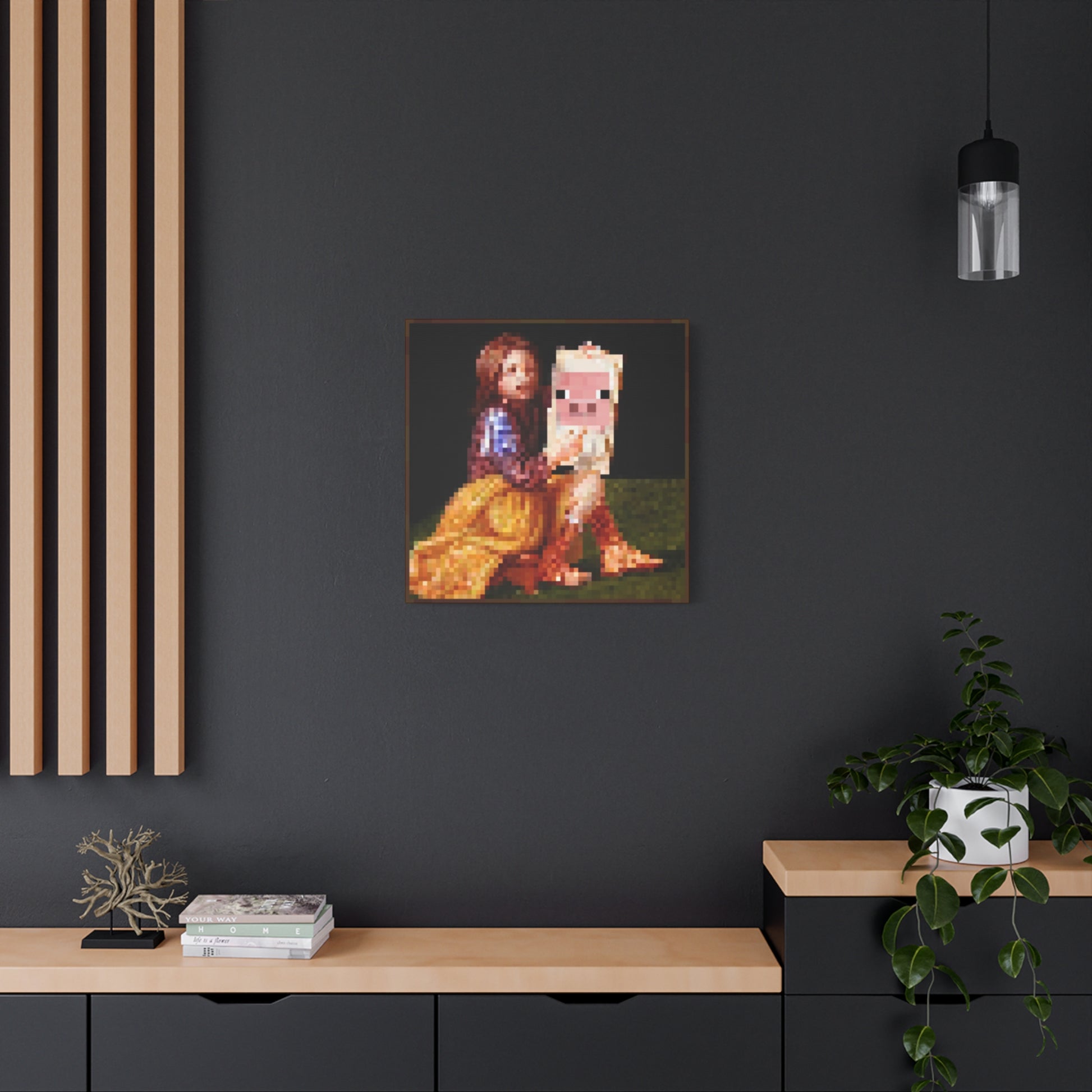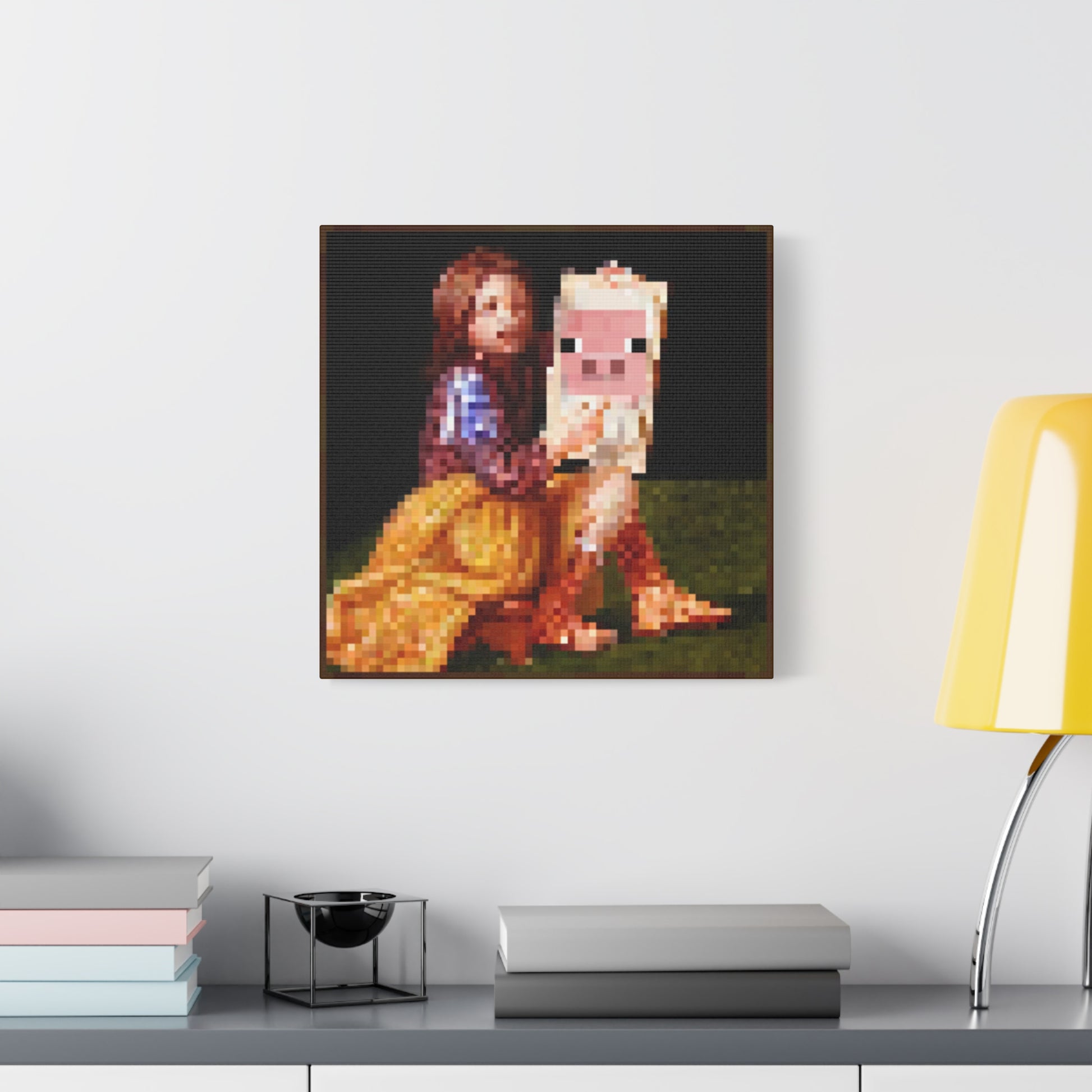 Bring pixelated nostalgia into your space with this Minecraft-inspired painting featuring the iconic pig and lady motif. Rendered in classic blocky aesthetics, this piece captures the charm of early gaming culture while serving as a conversation starter for collectors and enthusiasts alike. Perfect for bedrooms, gaming rooms, or creative studios, it combines retro appeal with contemporary decor sensibilities. The vibrant color palette and recognizable imagery make it an ideal accent for anyone seeking to celebrate gaming heritage through wall art.